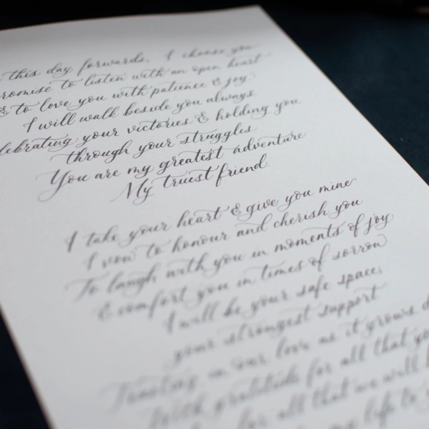 Calligraphy commissions including wedding vows, favourite poems, song lyrics and more - all written out in a modern calligraphy script using traditional dip pen and ink.
